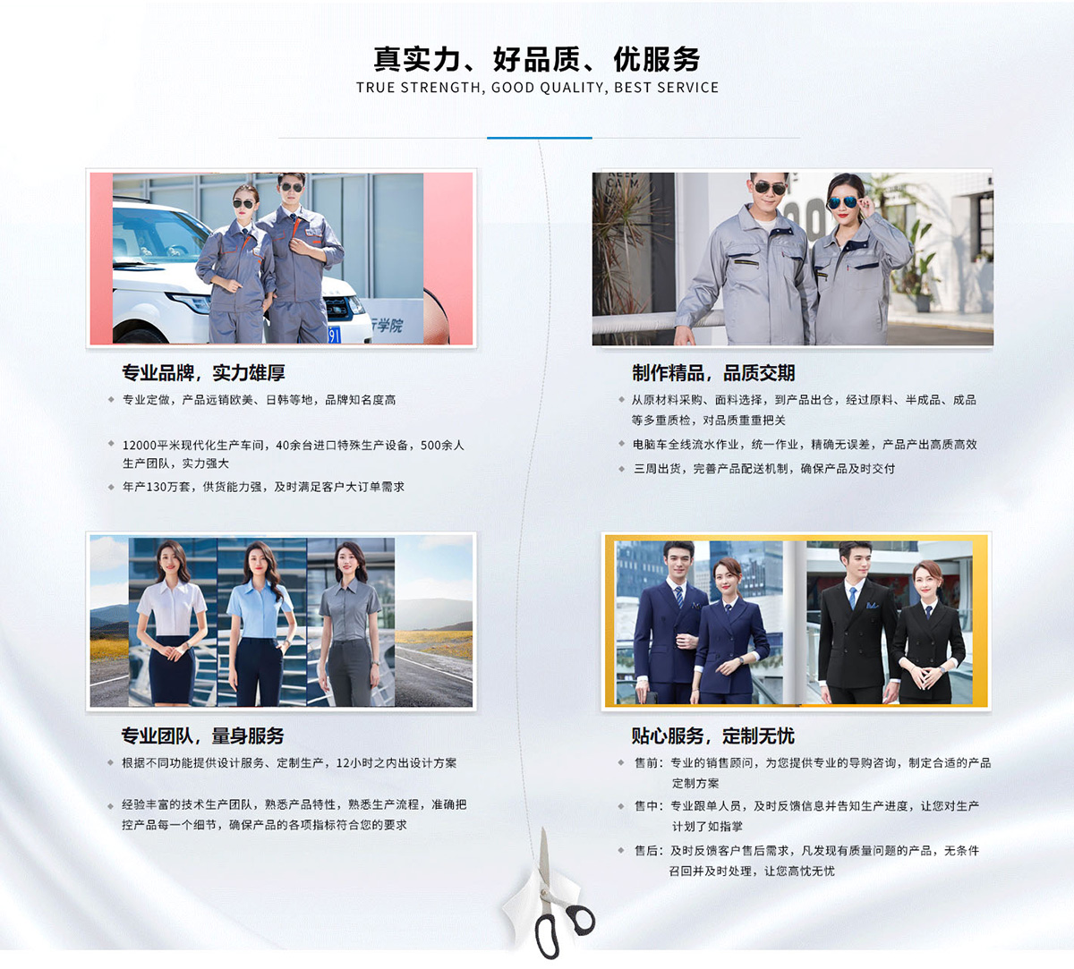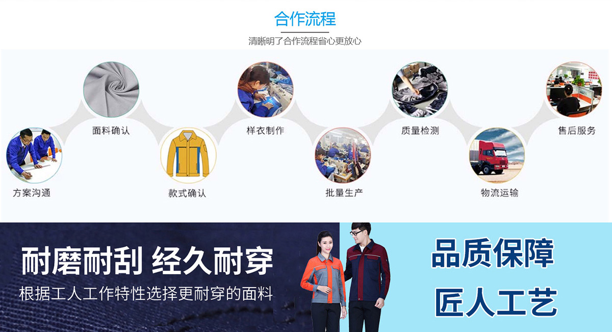 ◆ 融入我們的生產(chǎn)和設(shè)計中,為客戶提供完美的工作裝產(chǎn)品!